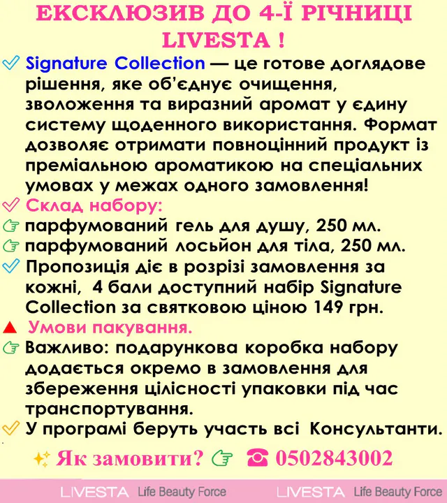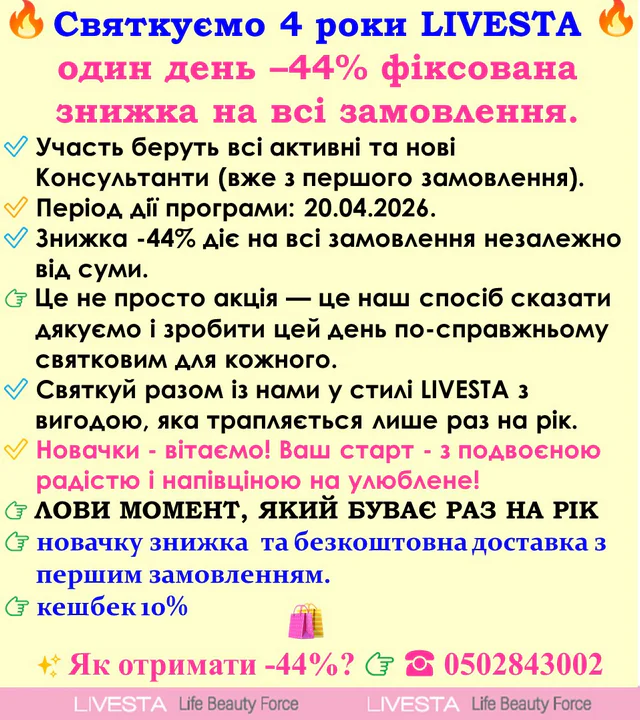 Косметика Лівеста|Livesta – це нова косметична компанія, яка пропонує великий асортимент продукції світових брендів із різних країн, вигідні ціни та акції. У назві нової компанії поєдналися найголовніші поняття для кожного з нас: LIVE – як прагнення жити та VESTA – символ родинного кола та сімейного благополуччя. Лише турбота про ближнього, краса навколо, душевна доброта та сила наших сердець об’єднує всю хоробрість українців, яку ми уособили в LIVESTA. Наш каталог наповнений виключно сертифікованими, якісними та інноваційними продуктами для всієї родини.