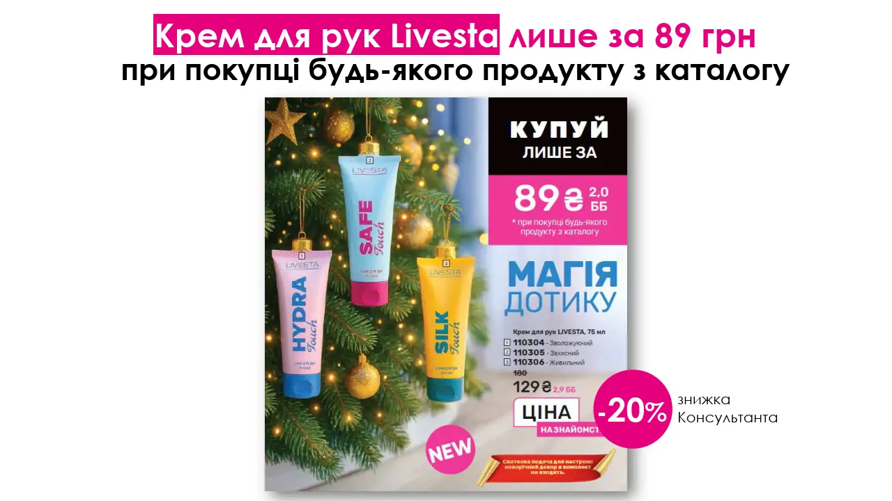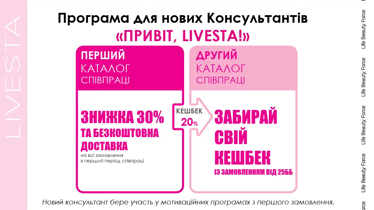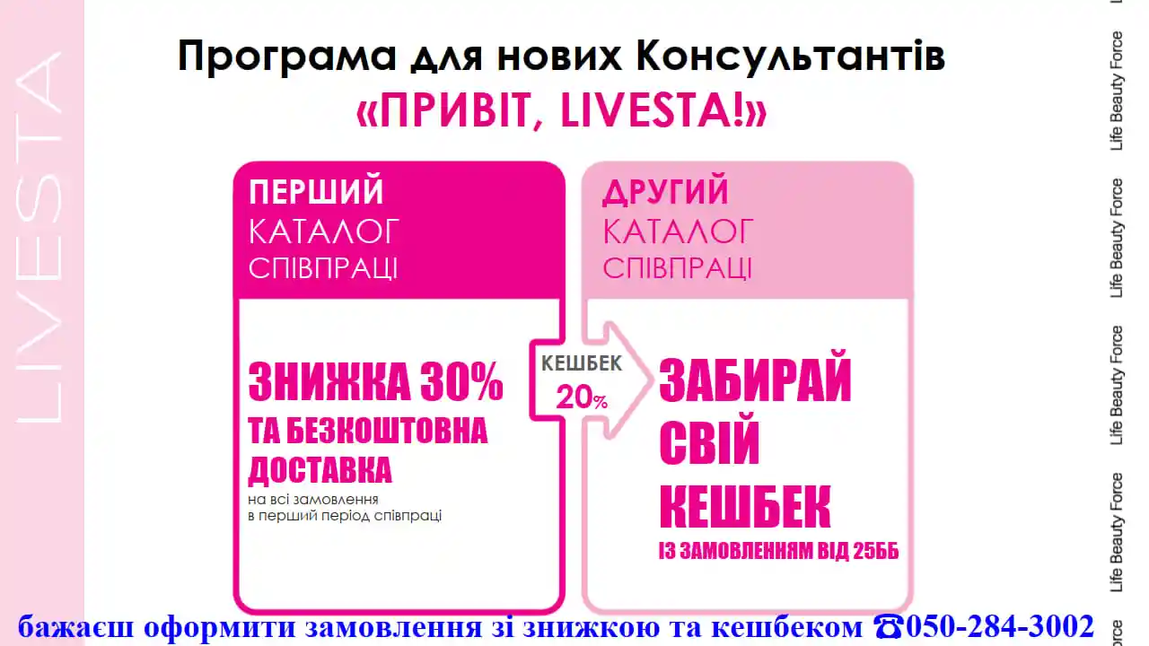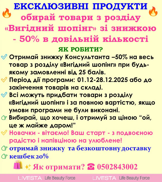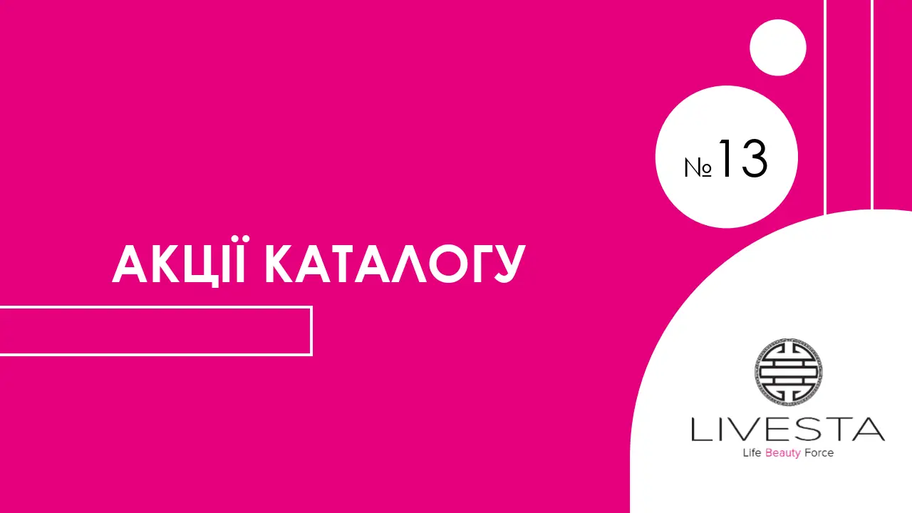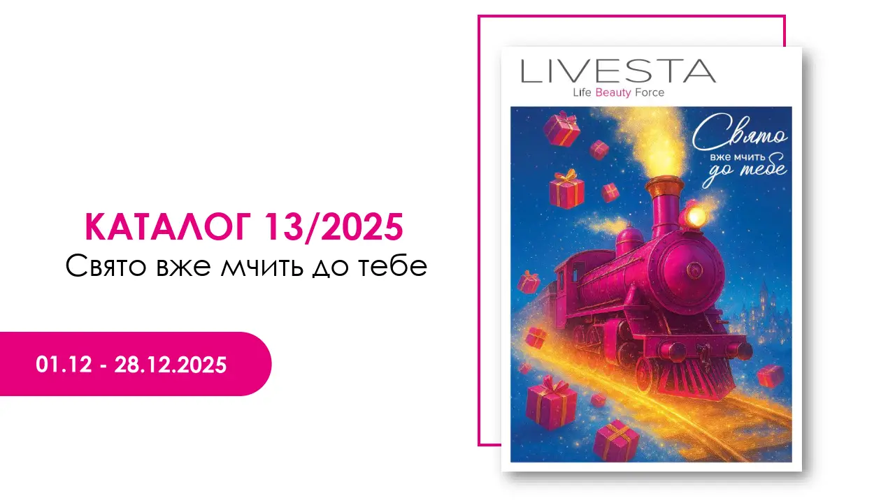 Ми готові заохотити вас вигідними програмами 13 каталогу 2025.💗 Асортимент LIVESTA - 216 продуктів за акційними цінами, 444 круті цін, 7 акції .● Активуй дисконт та отримай 30% знижки та 20% кешбек.● Розкажи подружкам про нас та запрошуй познайомитися з усіма можливостями.ДІЗНАЙСЯ ПРО:✅Пропозиції для Новачків;✅Програма підтримки на грудень каталог №13 2025;✅Навчання, інтенсиви, марафони;✅Вебінари