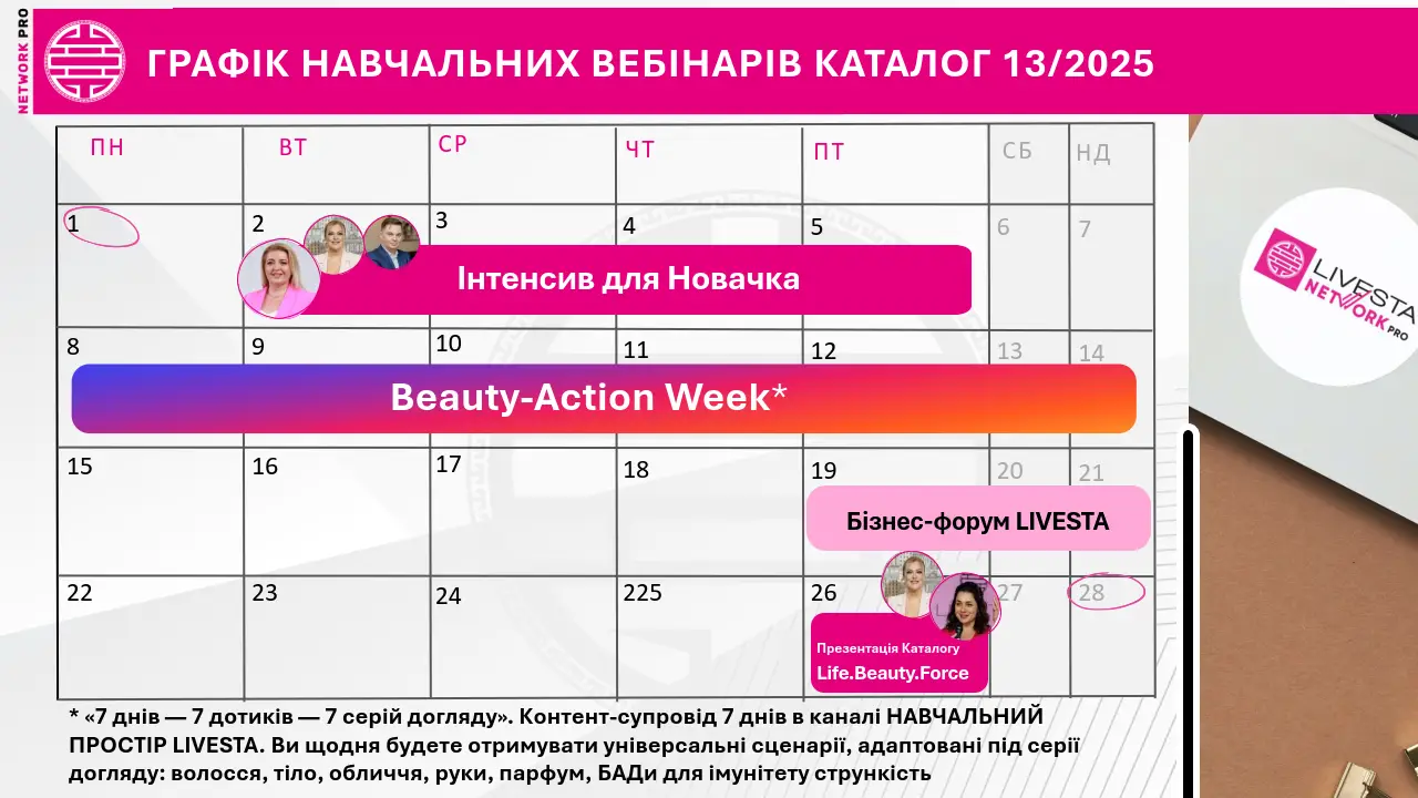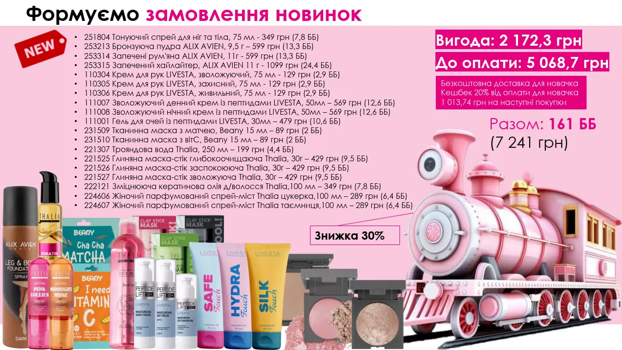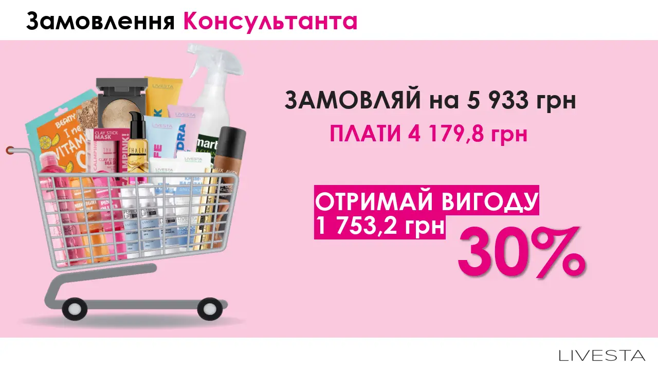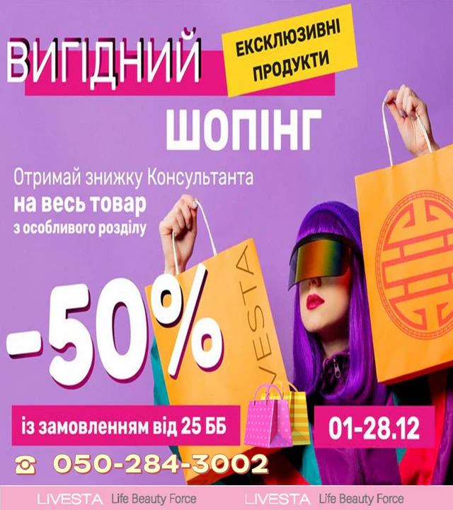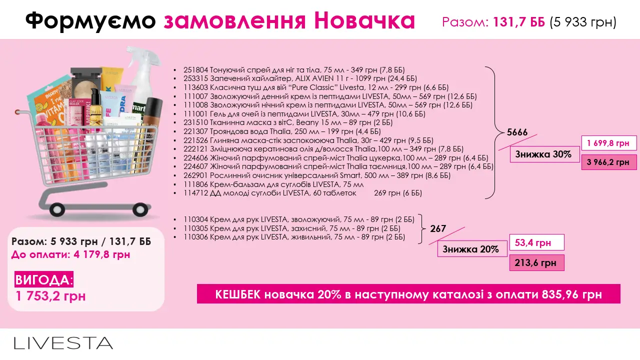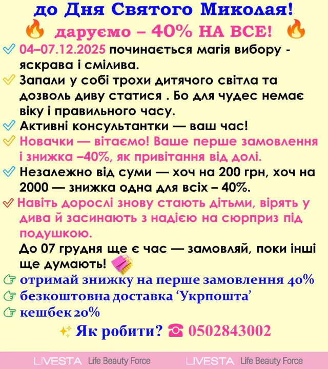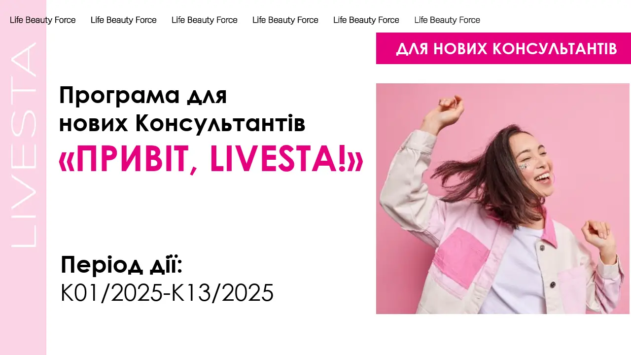 Ми готові заохотити вас вигідними програмами 13 каталогу 2025.💗 Асортимент LIVESTA - 216 продуктів за акційними цінами, 444 круті цін, 7 акції .● Активуй дисконт та отримай 30% знижки та 20% кешбек.● Розкажи подружкам про нас та запрошуй познайомитися з усіма можливостями.ДІЗНАЙСЯ ПРО:✅Пропозиції для Новачків;✅Програма підтримки на грудень каталог №13 2025;✅Навчання, інтенсиви, марафони;✅Вебінари