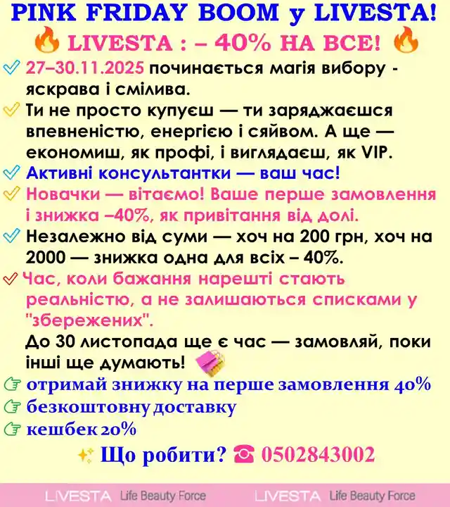 💗 Ніжність завжди виграє. Охолоджувальна маска Livesta лише за 179 грн при покупці будь-якого продукту з каталогу.🎁 НОВІ КОНСУЛЬТАНТКИ Вам -30% НА ВСЕ! Це не знижка. Це — старт твоєї історії краси, доходу і свободи.🎁 Кешбек 20% з замовлення! 💛 💙Дякуємо всім, хто захищає нашу державу!